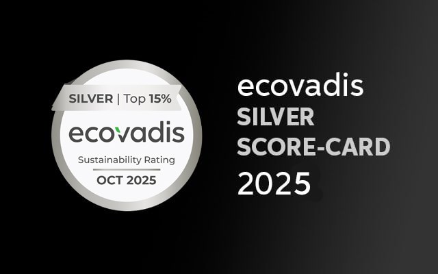Ihre Methodik umfasst sieben Managementindikatoren und 21 Nachhaltigkeitskriterien in vier Bereichen: Umwelt, Arbeit und Menschenrechte, Ethik und nachhaltige Beschaffung. Ecovadis hat unser Geschäftsmodell und unsere Betriebsabläufe getestet, um unsere globale Leistung zu bewerten und hat das entsprechende Ergebnis als silberne Scorecard veröffentlicht, die eine hervorragende Positionierung unseres Unternehmens in allen oben genannten Bereichen aufzeigt.